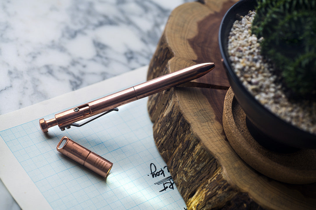 Handcrafted in the USA from tellurium copper, this pen's design takes a unique spin on a classic 'clicker', incorporating a bolt-action lever to deploy the ballpoint tip. And Karas Kustoms has taken great care to be sure that this pen will last you for years to come, as the high quality of construction intersects with the fact that it is compatible with any Parker ballpoint compatible refill - including the Fisher Space Pen pressurized cartridge. If you want a superb pen that's sure to impress, this is the one for you.
